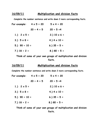 Mixed multiplication and division facts worksheet. Multiplication and division question sheets. These math worksheets provide great practice for returning to multiplication after the division facts have been mastered, and they reinforce the division and . Here you will find our worksheet generator for a range of free multiplication division worksheets for kids by the math salamanders. Excellent starter, especially if you want them to settle down .